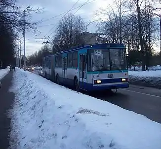 Привід тролейбуса: складається з двох однакових провідних вузлів, які в режимах їзди й гальмування працюють спільно з тиристорно-імпульсною регуляцією тягових двигунів.
