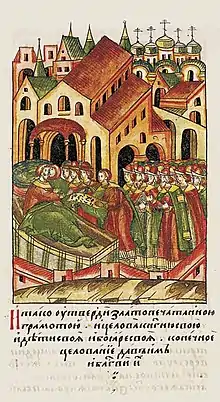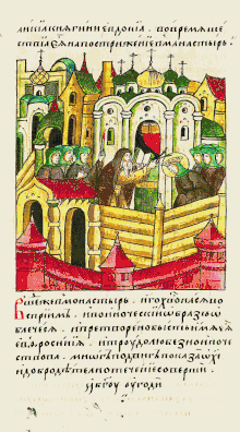 - Церква Різдва Богородиці та прикрасила його кращими іконами, начинням, книгами; Різдвяний храм був освячений 11 лютого 1393 року в присутності всієї великокнязівської родини святителем [Кіпріяном, а через два роки був розписаний кращими іконописцями — Феофаном греком і Сімеоном Чорним;