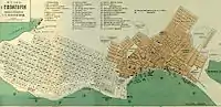 1675 року, під час походу, місто здобули загони Івана Сірка. Ґьозлеве було оточене кріпосною стіною, загальною довжиною близько трьох км. Висота її становила 6—8 м, ширина 3—5 м. Стіна побудована у вигляді п'ятикутника, мала п'ять воріт: на схід біля берега моря — Портові ворота, на південний схід — ворота Дров'яного базару, на північну сторону виходили ворота Білого мулли, на північний захід — Земляні ворота, на захід — Кінські ворота.
