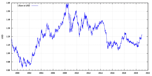 Європейський центральний банк, як правило, не втручається у формування курсу обміну євро до інших валют, обравши натомість за інструмент монетарної політики рівень процентних ставок.[22] Після введення євро, його курс по відношенню до інших валют значно впав, особливо по відношенню до долара США. Після початкового курсу 1,1789 $/€ (0,8482 €/$), євро впало до мінімуму 0,8228 $/€ (1,2154 €/$) 26 жовтня 2000 року. Після появи банкнот і монет 1 січня 2002 року і заміну всіх національних валют, євро почало поступово зміцнюватись і досягло паритету (1:1) з доларом США 15 липня 2002 року і, після цього, не опускалося нижче паритету.