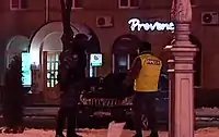 - Увечері 25 листопада, на тій самій Європейській площі, під час зачитування судовими виконавцями постанови про заборону акції на Європейській площі Дніпропетровська, на людей, що зібралися на черговий мітинг, набігло багато т. званих «тітушок», молодиків міцної статури, які вщент розтрощили наметове містечко і жорстоко побили маніфестантів[139]. У момент побиття мирних маніфестантів нікого з правоохоронців, які до цього чергували на майдані, поруч не виявилося. Згодом з'явилася інформація про причетність до розгону мітингувальників віце-прем'єр-міністра України Олександра Вілкула і його креатури — секретаря міськради Максима Романенка.[140]