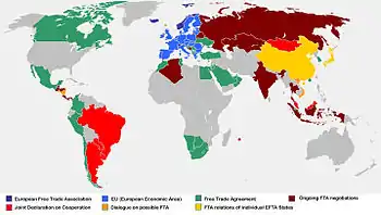 Три країни-члени ЄАВТ, зокрема, Ісландія, Ліхтенштейн та Норвегія входять до Європейського економічного простору (ЄЕП), угоду про створення якого було укладено у травні 1992 року. ЄЕП об'єднує ринки 27-и країн-членів ЄС та 3-х країн-членів ЄАВТ у спільний ринок обсягом близько 470 млн споживачів, що робить його найбільшим регіональним інтеграційним об'єднанням у світі. Згідно з результатами проведеного 1992 року референдуму, Швейцарія не вступила до ЄЕП, але розвиває торговельно-економічне співробітництво з ЄС шляхом укладення двосторонніх угод. ЄАВТ створила зони вільної торгівлі з ЄС та Фарерськими островами.