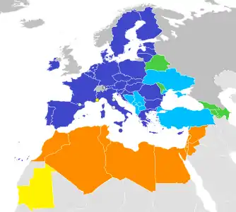 Європейська політика сусідства (ЄПС) спрямована на те, щоб не припустити виникнення нової лінії розподілу між розширеним ЄС та його сусідами, і надати їм можливість брати участь в різних видах діяльності ЄС шляхом тіснішої політичної, економічної, культурної співпраці та взаємодії в галузі безпеки. Концепція ЄПС охоплює такі країни: Алжир, Азербайджан, Білорусь, Вірменія, Грузія, Єгипет, Ізраїль, Йорданія, Ліван, Лівія, Молдова, Марокко, Сирія, Туніс, Україна, а також Палестинська автономія.
