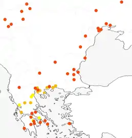 ![]() Записи сучасного лева на південному сході Європи: червоний — розкопані залишки; помаранчевий — місця, згадані давньогрецькими авторами; жовтий — місця, згадані в грецьких легендах | ||||||||||||||||||||