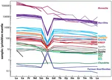 Зазвичай, всі лантаноїди в усіх мінералах присутні разом, і їх пропорція також зберігається (важчі лантаноїди мають меншу концентрацію). Проте, через те, що хімічні властивості європію трохи відрізняються від решти лантаноїдів, він не підкоряється цій закономірності. Це явище носить назву європієвої аномалії. При описі мінералів, у яких концентрація європію значно менша за очікувану, кажуть про негативну європієву аномалію, а для тих, у яких концентрація вища — про позитивну європієву аномалію[7].