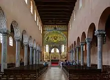 На мозаїці тріумфальної арки над абсидою зображений Христос, що тримає розкриту книгу з текстом «Я світло істинне» і апостоли. Нижче розташовані мозаїчні медальйони із зображенням Агнця і портрети 12 мучениць. Звід над абсидою прикрашений мозаїкою, що зображує Марію з Немовлям, що сидять на небесному троні. З боків знаходяться зображення ангелів і місцевих святих, у тому числі святого Мавра, архідиякона Клавдія, єпископа Евфразія. Всі фігури зображені стоячими на квітковому лузі.
