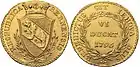 Напис «BENEDICTUS SIT IEHOVA DEUS» («Нехай Бог Єгова буде прославлений») на золотій монеті вартістю 6 дукатів, Швейцарія, 1796 рік.