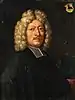 Девіз родини Фрайшинг «Jehova Pastor Meus» у правому верхньому кутку портрету Самуеля Фрайшинга над родовим гербом (ягня), 1700 рік.