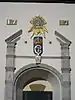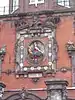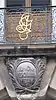 Напис «PAX CIVIVM ET CONCORDIA TVTISSIME VRBEM MVNIVNT CVSTOS ESTO MIHI DEVS IEHOVA» під рельєфом Дордрехтської дівчини, оточеної гербами 15 міст, Дордрехт, Нідерланди, 1618 рік.