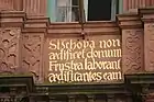 Напис «Si Jehova non aedificet domum Frustra laborant aedificantes eam» («Якщо Єгова не будує дому, то даремно трудяться будівельники», Псалом 127:1) на Будинку лицаря в Гайдельберзі, Німеччина, 1592 рік.