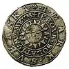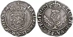 Напис «REGEM IOVA PROTEGIT» («Єгова захищає короля») на реверсі монети Якова VI — короля Шотландії, 1602 рік.
