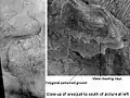 Канал, по якому текла вода у кратер Єзеро, а також збільшене зображення глиняних відкладів.