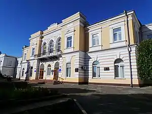 Фасад приміщення колишньої міської класичної гімназії прикрашають численні меморіальні дошки на честь її славних випускників.