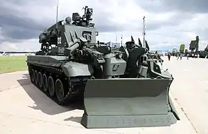 - бульдозерний відвал, встановлений спереду корпуса і здатний працювати в двовідвальному, бульдозерному або грейдерному положенні. Регулювання положення відвалу здійснюється гідросистемою без виходу екіпажу з машини.[2]