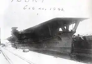 За проектом «Ібукі» мав типову японську архітектуру: невеликий «острів» по правому борту, одну вигнуту донизу та назад димову трубу. Половину парових котлів крейсера зняли, щоб звільнити місце для додаткових цистерн палива та авіаційного бензину. Корпус обладнали булями для підвищення остійності та посилення протиторпедного захисту. Передбачалось що внаслідок цього, а також через менший тиск пари в турбінах швидкість (порівняно з крейсером) зменшиться на 4 вузли.