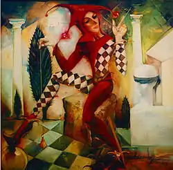 «Блазень у капелюсі з балабончиками. Душа, занурена у світ власних фантазій і переживань. Картина Сергія Іванова називається „Роздуми“. Кожна деталь на полотні видається, з одного боку, випадковою, а з іншого — виправданою внутрішньою логікою картини. Скульптурна голова позаду блазня має зав'язані чорною стрічкою очі: душі не потрібні очі, щоб бачити. Зміщені кути дивної форми кімнати, зміщене шахове поле підлоги: душа живе у власному світі, де не діють закони тривимірного простору. У кришталевій кулі під ногою блазня не віддзеркалюється майбутнє: душа сама знає все наперед».