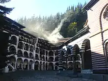 Монастир зведено навколо могили Івана Рильського. Зовнішні мури заввишки 24 м і завтовшки 2 м, роблять святиню подібною до фортеці. Для зведення будівель монастиря використали білий і чорний мармур.