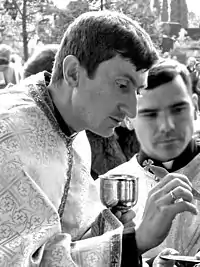 ![]() Причащання під час Літургії на Микулинецькому цвинтарі в день святкуваня 20-річчя виходу з підпілля УГКЦ (18.10.2009). | |