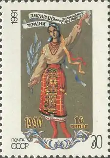 О. А. Івахненко є автором перших поштових марок України. 16 липня 1990 року Верховна Рада Української РСР прийняла Декларацію про державний суверенітет України. Олександр Івахненко отримав від Міністерства зв'язку УРСР замовлення на виготовлення поштової марки, присвяченої цій події. Він запропонував декілька ескізів, які обговорювалися в Міністерстві зв'язку УРСР і Верховній Раді республіки. На одному з перших варіантів дівчина, що символізує Україну, була одягнена в сорочку-туніку і босонога. Її запропонували «взути» в чоботи і замість червоної спідниці «надіти» плахту. У вінок була додана блакитна стрічка, через що синій фон марки змінили на золотистий. Напис на марці була: «Пошта УРСР», проте при підготовці малюнка до друку, її змінили на традиційну — «Пошта СРСР».[3] Марка вийшла в обіг 10 липня 1991 року.