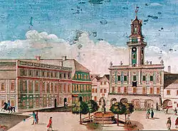 - Стара будівля палацу Потоцьких у Львові, розібрана на початку 1860-х. Вигляд палацу відомий зі збереженого проекту 1822 року.[3]