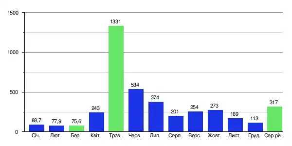 Середньомісячна витрата води в річці (м³/с) в районі села Іжма, Комі (79 км від гирла) з 1981 по 1991 роки[1]