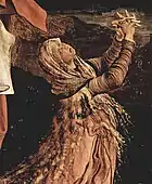 Зліва від Ісуса Матіас Грюневальд помістив Марію Магдалину у молитві. Поруч з нею її традиційний атрибут — посудина з притираннями, на ній можна розрізнити число 1515 — ймовірно, рік створення вівтаря. Обличчя Марії Магдалини звернене до Ісуса, рух її рук з переплетеними пальцями висловлює відчай.