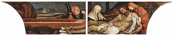 Коли відкриваються перші стулки вівтаря з зображенням Розп'яття, пределла зі сценою оплакування Христа залишається на місці. Другою розгорткою Ізенгеймського вівтаря монахи могли милуватися в різдвяні дні. Навіть у світлі святкові дні пределла служила нагадуванням про те, що за радістю народження слідує гіркота втрати.