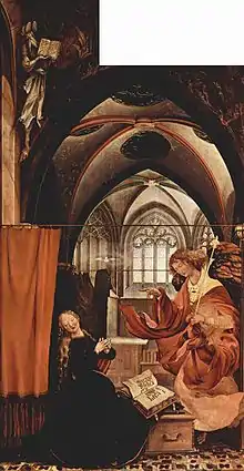 На відміну від інших художників, що зображали сцену Благовіщення в житлових приміщеннях, наприклад, в спальні Марії, як у ван дер Вейдена, Грюневальд в своєму «Благовіщенні» поміщає діву Марію до готичної каплиці. В апокрифах і «Золотій легенді» Якова Ворагінського вказувалося, що дитинство Марії пройшло у храмі, де вона читала писання про прихід Месії.