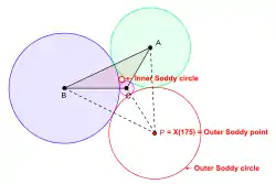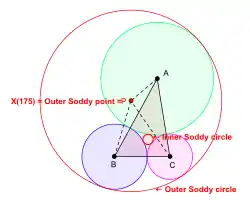Для даного трикутника ABC можна накреслити кола в площині трикутника ABC з центрами в точках A, B і C так, щоб вони дотикалися один до одного зовні. Загалом, можна намалювати два нових кола, кожне з яких буде дотичним до трьох кіл з центрами A, B, C. (Одне з кіл може виродитися в пряму лінію.) Ці кола називають колами Содді трикутника ABC. Коло з меншим радіусом є внутрішнім колом Содді, а його центр називається внутрішньою точкою Содді або внутрішнім центром Содді трикутника ABC. Коло з більшим радіусом є зовнішнім колом Содді, а його центр називається зовнішньою точкою Содді або зовнішнім центром Содді трикутника ABC. [6] [7] Чудова точка трикутника X(175), ізопериметрична точка в розумінні Кімберлінга, є зовнішньою точкою Содді трикутника ABC.