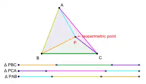 У геометрії ізопериметрична точка - це особлива точка, пов'язана з плоским трикутником. Термін був спочатку введений Г. Р. Вельдкампом у статті, опублікованій в American Mathematical Monthly в 1985 році, для позначення точки P у площині трикутника ABC, яка має властивість, що трикутники PBC, PCA і PAB мають рівні периметри, тобто [1] [2] PB + BC + CP = PC + CA + AP = PA + AB + BP.