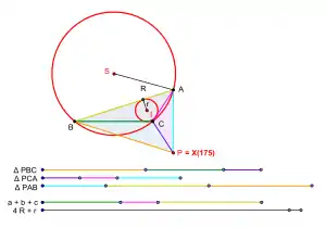 - P лежить на прямій, що з'єднує центр вписаного кола і точку Жергона трикутника ABC.