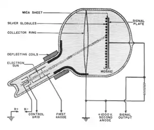 Головним елементом для формування зображення у іконоскопі є слюдяна пластина з нанесеним на передню поверхню фоточутливими гранулами. Матеріал цих гранул, як правило — срібло, вкрите цезієм чи оксидом цезію; гранули зафіксовані на пластині за допомогою клею, що є електричним ізолятором. Зворотня (задня) сторона слюдяної пластини вкрита тонким шаром срібла. В цілому вся конструкція є не чим іншим, як масивом конденсаторів, що можуть деякий час тримати електричний заряд. Кожен індивідуальний конденсатор відповідає пікселю зображення. Вся ця система називалася також «мозаїкою».