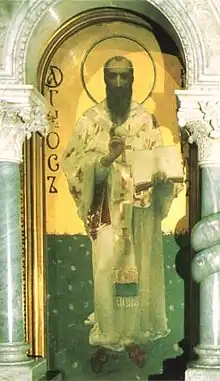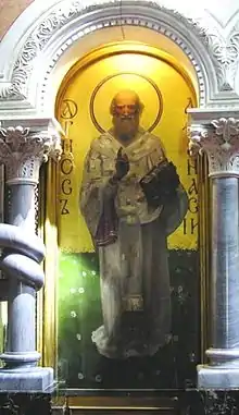 2. На наступній іконі намальовано трьох святителів на повен зріст; двоє з них з Євангелієм у руках, третій — мабуть, апостол Петро, має в руках ключі; обличчя звернені до центру іконостаса — в бік наступної, серединної ікони.