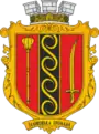 У червоному полі чорний стовп із золотими облямівками, на якому золотий трипільський орнамент. На першій частині - золотий пернач у стовп, на другій - золота козацька шабля у стовп вістрям догори. Щит облямований золотим декоративним картушем і увінчаний срібною короною.