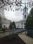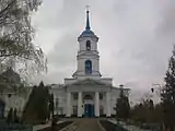 Церква зведена в еклектичному класицистичному стилі на штучному насипі. Храм одноярусний, чотиристовпний, прямокутний в проекції, центричного типу. В абрисі є відображенням стереотипного уявлення російської архітектури «церква-корабель». Від заходу прибудований бабинець, над яким надбудовано двоярусну вежу покриту куполом, який завершується шпилем. Перед бабинцем збудовано портик у вигляді трикутного фронтону, розміщеного на чотирьох колонах. Південний, східний та північний фасади опоряджені маловиразними ризалітами увінчаними трикутними фронтонами. Центричний характер будівлі підкреслено розвиненим барабаном вкритим півсферичним куполом, який завершується ліхтарем.