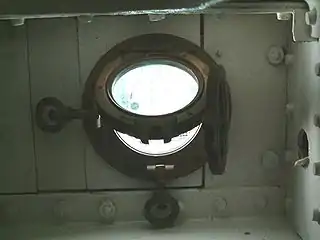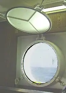 Складається з литої рами, що облицьовує круглий виріз у зовнішній обшивці і прикріплюється до неї на болтах або заклепках. На цю раму на шарнірі навішується внутрішня рама з вставленим товстим корабельним склом (близько 12 мм завтовшки). Водонепроникність досягається гумовим кільцем на внутрішній рамі, яке при натисканні цієї рами на зовнішню раму впирається у виступ на останній. Натискання проводиться задрайкою. Для забезпечення водонепроникності борту і для затемнення ілюмінатор має ще глуху кришку. Вона обертається на шарнірі і задраюється аналогічно самому ілюмінатору.