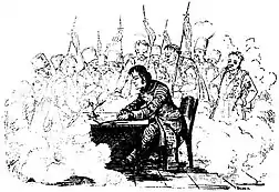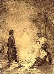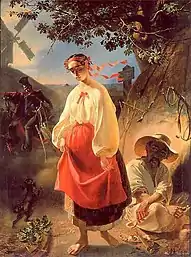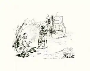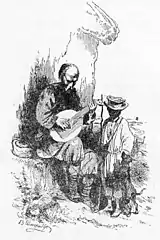 лівій стороні. На малюнку зображений кобзар з народним інструментом та хлопчиком. «Чигиринський кобзар та гайдамаки» містив копію цього малюнку виконану невідомим автором . В 1844 році Яків де Бальмен та Михайло Башилов зробили малюнки майже до всіх творів, які на той час були надруковані в Кобзарі. Це, зокрема, поеми «Перебендя», «Катерина», «Тарасова ніч», «Іван Підкова», «Гайдамаки» та «Гамалія», послання «До Основяненка» і балада «Тополя».[1]