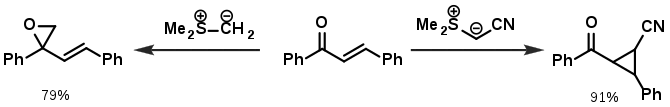 У реакціях з оксосполуками усі іліди сульфонію утворюють епоксиди. Однак, у реакціях з α,β-ненасиченими оксосполуками реактивність діалкільних ілідів та стабілізованих ілідів значно відрізняється; так, буде завжди утворювати епоксиди з оксогрупою, в той час як стабілізовані іліди будуть переважно реагувати з подвійним зв'язком до циклопропанів: