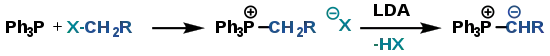 Оскільки фосфонійгалогеніди є дуже слабкими кислотами, для їх депротонування необхідні сильні основи, такі як KOtBu, LDA або NaHMDS.