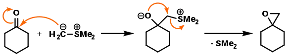 Як і фосфонієві іліди, іліди сульфонію реагують з оксосполуками. Однак, у той час як реакція Віттіга проходить через чотирьохчленний перехідний стан з подальшим елімінуванням, у випадку сульфонієвих ілідів механізм являє собою нуклеофільне приєднання до оксогрупи: