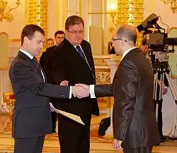 - Dmitry Medvedev received letters of credence from ambassadors of foreign countries and the European Union. The Kremlin, Moscow: President of Russia. 16 грудня 2009. Архів оригіналу за 20 березня 2012. Процитовано 20 січня 2011.