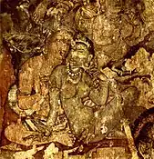 Скельні ансамблі Аджанти відомі перш за все своїм живописом. Цей вид образотворчого мистецтва відомий в Індії з початку I тисячоліття до н. е.. Однак, через те, що під дією вологого клімату живописний шар швидко руйнується, печерні храми Аджанти є чи не єдиною збереженою пам'яткою, за якою можна зробити висновок про розписи Гуптської епохи. Стінопис Аджанти датують 4—7 століттям. Живопис зберігся лише в шістнадцяти печерах. Тут були розписані стелі, стіни і навіть колони.[16] Спочатку майстри готували суміш із глини, коров'ячого гною і порошку трапового каменю, іноді додаючи для міцності рисове лушпиння. На цей шар спеціальною щіткою наносили найтонший шар білої штукатурки «чунам» і полірували його тонкою залізною лопаткою. Для приготування фарб розтирали яйця, додаючи рисовий відвар, патоку, клей і потрібні барвники (крім ляпіс-лазурі, привезеної з острова Ланка, їх отримували з місцевих мінералів).