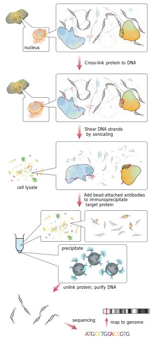- ДНК та білки хроматину в живих клітинах або тканинах «зшиваються» (англ. crosslinking) між собою за допомогою хімічних реагентів або жорсткого ультрафіолетового опромінювання. Цю операцію пропускають в нативній імунопреципітації хроматину (англ. Native ChIP).