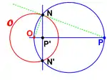 - Якщо відстань від P до O менша, ніж радіус кола — провести через P перпендикуляр до OP, а через точку його перетину з колом — дотичну до нього, яка перетне OP в шуканій точці P'