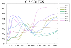 SPD із восьми зразків кольорів для випробувань (TCS), що використовуються для розрахунку індексу загального відтворення кольорів (CRI) - дозволяє легко відрізнити незначні відтінки кольору;