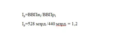 Номінальний ВВП в звітному році становить 528 млрд гр. од., реальний ВВП того ж періоду складає 440 млрд гр. од. Приріст номінального ВВП країни 10 %