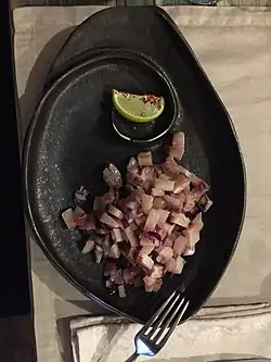 Після того, як кубики риби заморозилися, вони викладаються на холодну страву, змішуються з невеликою кількістю також нарізаної кубиками цибулі (кубики цибулі перед змішуванням розминаються руками, для того, щоб вони пустили сік), приправляються сіллю та чорним перцем, після чого кропляться невеликою кількістю рафінованої олії[5]. Перед подачею салат повинен настоятися 10-20 хвилин в холодильнику[6].