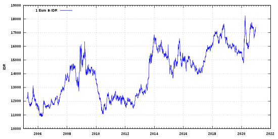 | 1 EUR = | 16 300 IDR (18 лютого 2022) |