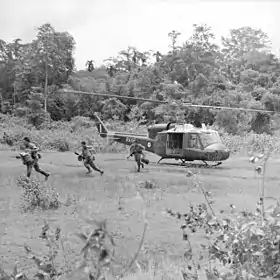 ![]() Малайзійські рейнджери висаджуються десантом з вертольотів UH-1 Г'юі. Малайзійські рейнджери висаджуються десантом з вертольотів UH-1 Г'юі. | |||||||||