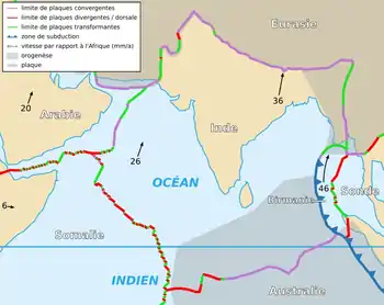 Північно-східний край Індо-Австралійської плити має субдукційну границю з Євразійською плитою через Індійський океан від Бангладеш, M'янми до індонезійських островів Суматра і Борнео.